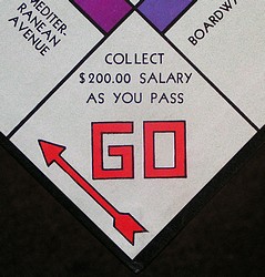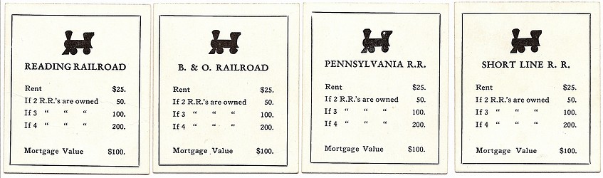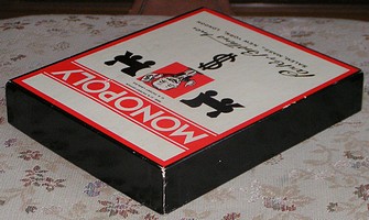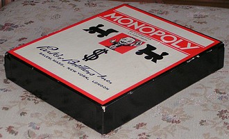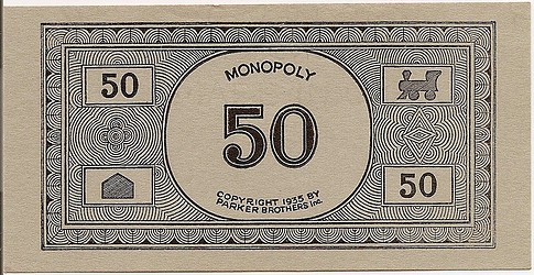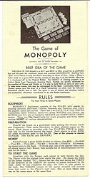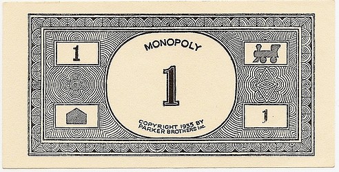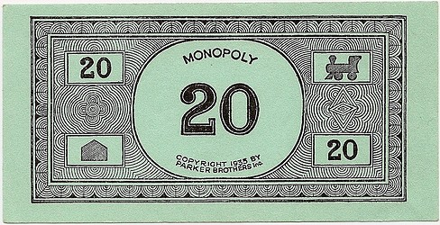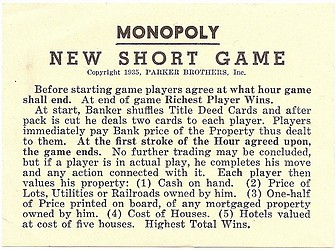 This game exhibits Parker Brothers redesign of the money, adding some more game specific logos, the house and the train, plus mention of a 1935 patent and Parker Brothers as the makers.