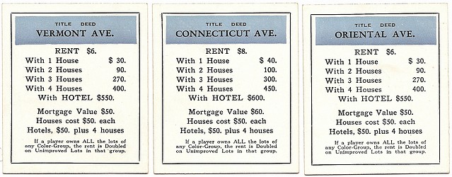 Also, this is a blank back Title Deed set, produced before Parker Brothers decided to print the mortgage info and property name on the back. This is a transitional set of deeds, a very rare combination of large white text and blank backs. It wasn’t very long after these were introduced that they added the text on the back. Most of the large white text sets are found with text on the back. Neat!