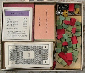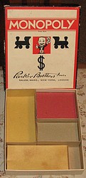 Darrow games did not include player pieces with the game but Parker Brothers figured that was a pretty important oversight so they bought metal tokens from the same folks who supplied metal tokens for Cracker Jack prizes. This game has 6 different player tokens, and each of these can also be found as period Cracker Jack prizes. As demand for the game increased, availability of metal player pieces dried up, so Parker Brothers used wooden pieces in some of these games.