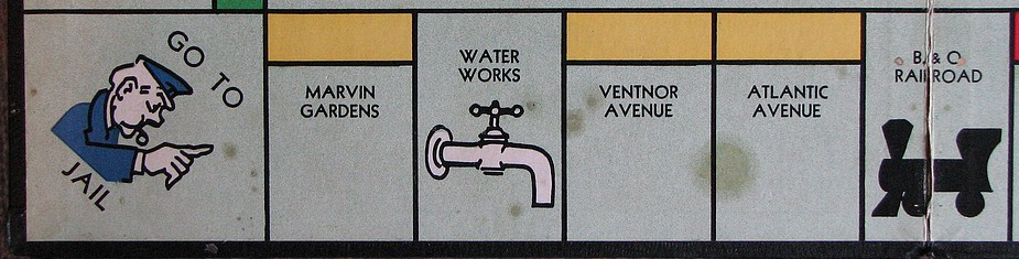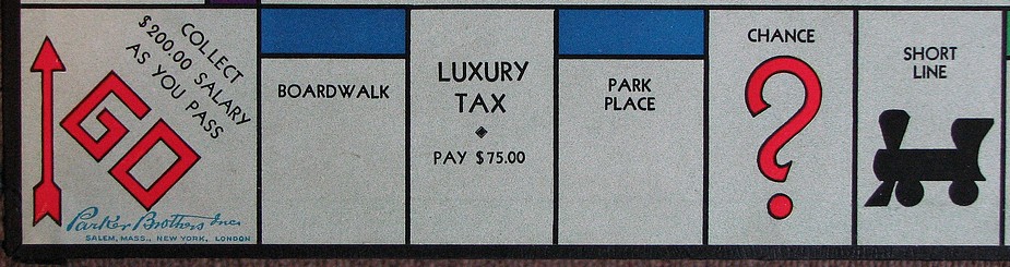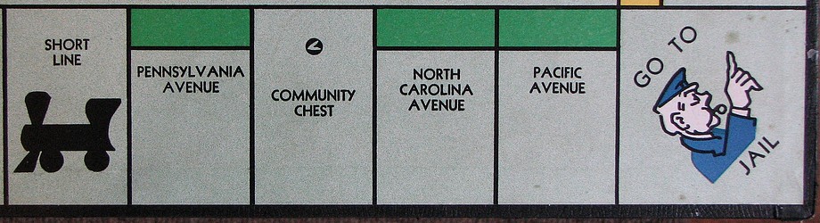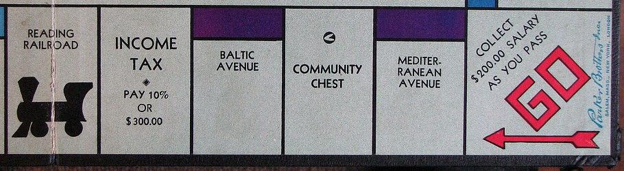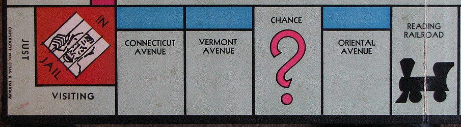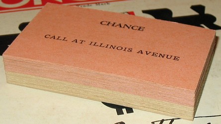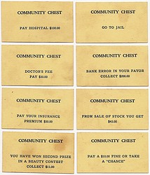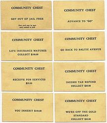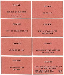 The CHANCE and COMMUNITY CHEST cards in this game use the same wording as the Darrow cards. It wasn't take long before Parker Brothers made a few changes in the wording, so instead of Advance to someplace, the Darrow style cards say Call at Illinois or Visit St Charles. Also, Parker Brothers added text instructing players to collect $200 if they pass go, which these cards lack. In addition, both CHANCE and COMMUNITY CHEST cards say GO TO JAIL in this game. Parker Brothers later added DO NOT PASS GO / DO NOT COLLECT $200.