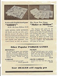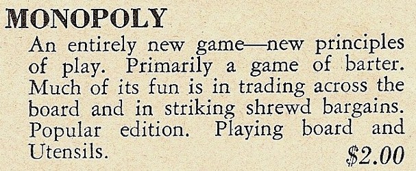 Parker Brothers described Monopoly as "An entirely new game - New principles of play". The ad wording is interesting, as it reminds us how different the game was from other games then on the market. The idea that it involved new concepts of play foreshadows the application for a patent. (thanks, David, for that insight)