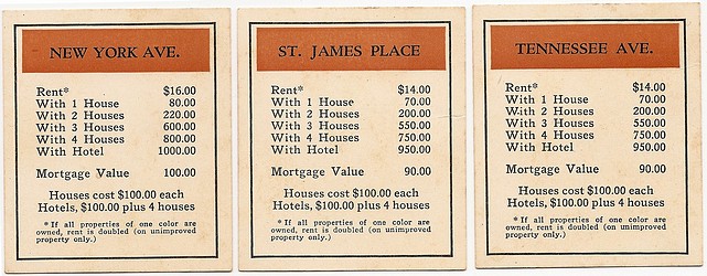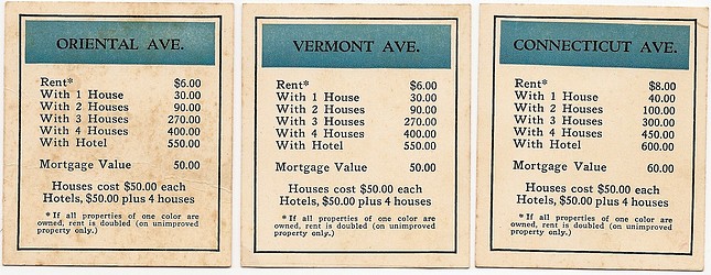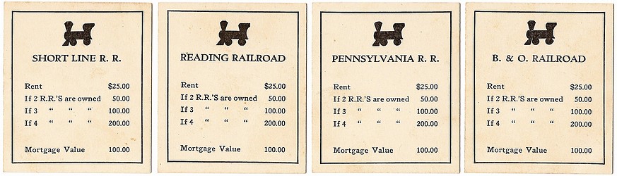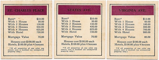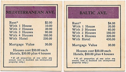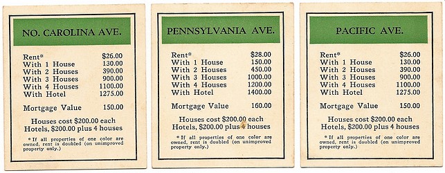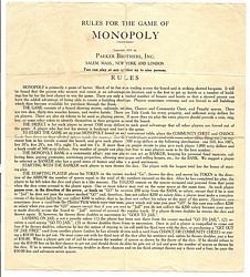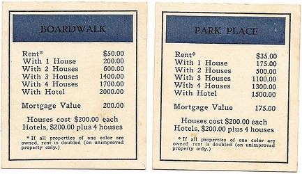 The title deeds for this game were also copied from the Darrow cards. They have blank backs and the color banners simply state the property name. When Parker Brothers redesigned the title deeds, they added the words 'Title Deed' to the banner. Other improvements were made over the next couple years, including changing the black text on dark colored banners to white, making them easier to read, and then placing the mortgage information on the back. Also, Darrow title deeds show the prices with .00 cents, while Parker Brothers dropped the 2 zero's on all the prices.