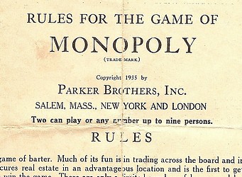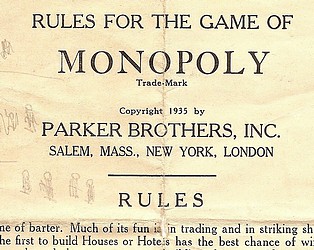 In 1935, Parker Brothers bought the rights to Monopoly from the 'inventor', Charles Darrow. Parker Brothers produced 24,000-25,000 games marked Trade Mark from June - August 1935, with the first batch of 10,000 game boards exhibiting the blue Parker Brothers overprint in the GO square. As many as 25% of those games could still exist today, with most exhibiting heavy wear.
